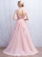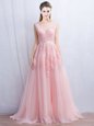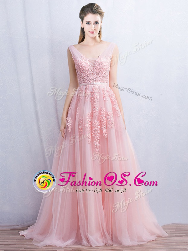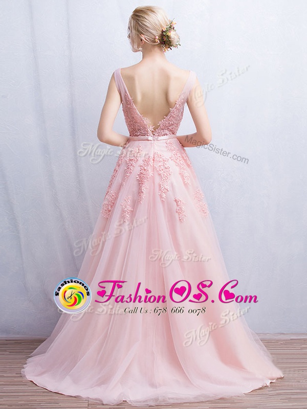 Customized Appliques and Belt Dress for Prom Baby Pink Backless Sleeveless With Brush Train