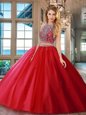 Home >  Quinceanera Dresses >  Luxurious Quinceanera Dresses > Customized Backless Scoop Sleeveless Quinceanera Dresses Floor Length Beading Red Tulle