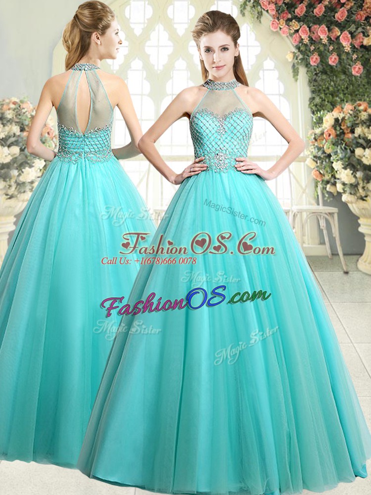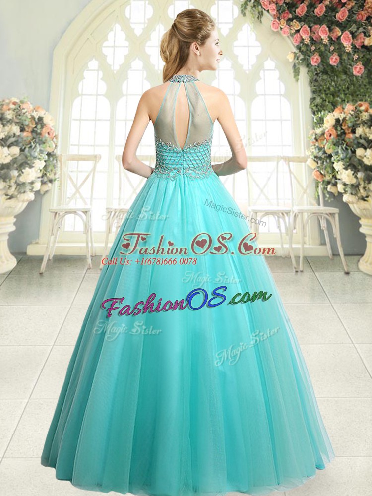 Customized Beading Prom Dresses Aqua Blue Zipper Sleeveless Floor Length