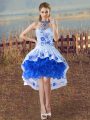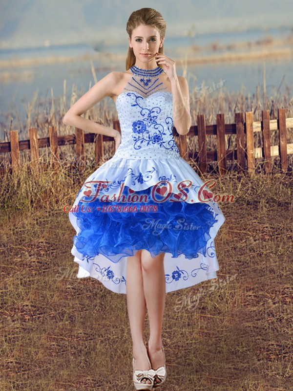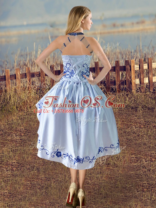 Customized Blue And White Evening Dress Halter Top Sleeveless Lace Up