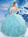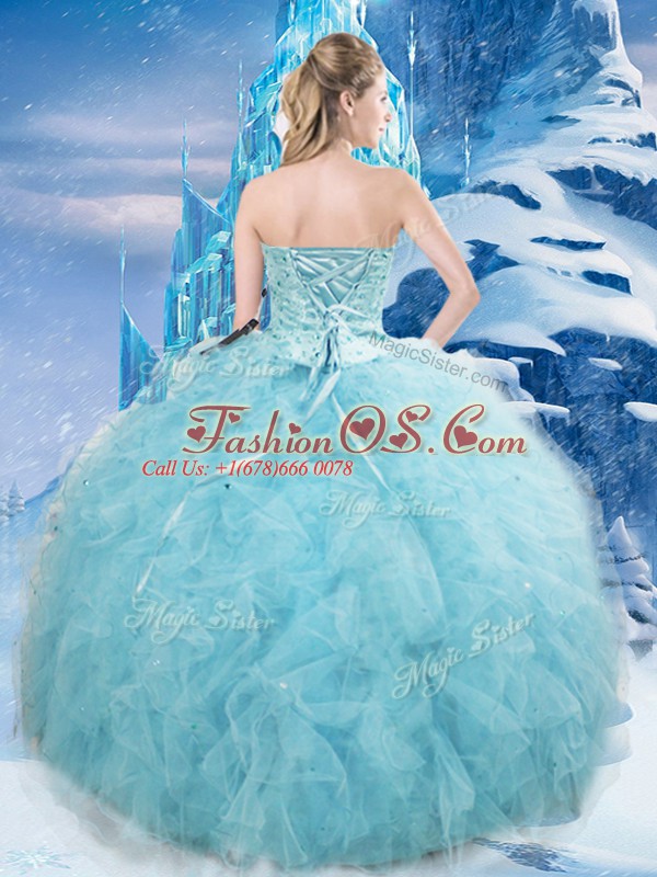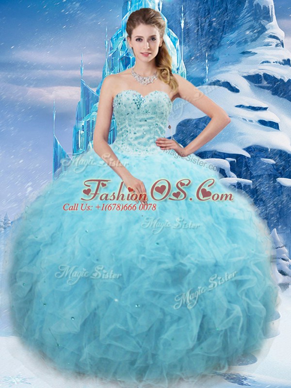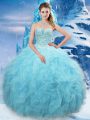 Customized Floor Length Aqua Blue Quince Ball Gowns Tulle Sleeveless Beading and Pick Ups