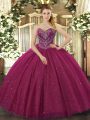 Customized Fuchsia Ball Gown Prom Dress Military Ball and Sweet 16 and Quinceanera with Beading Sweetheart Sleeveless Lace Up