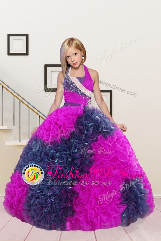 Customized Halter Top Hot Pink Sleeveless Floor Length Beading and Ruffles Lace Up Girls Pageant Dresses