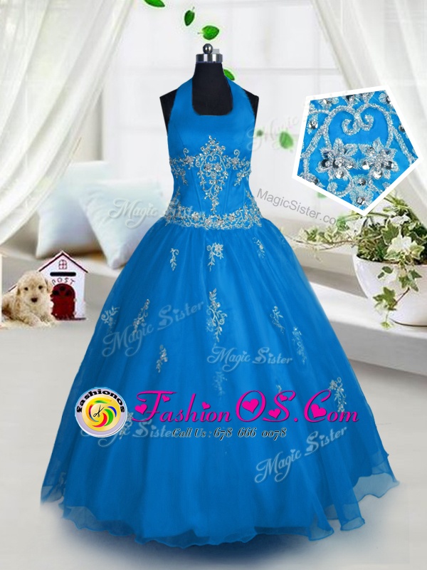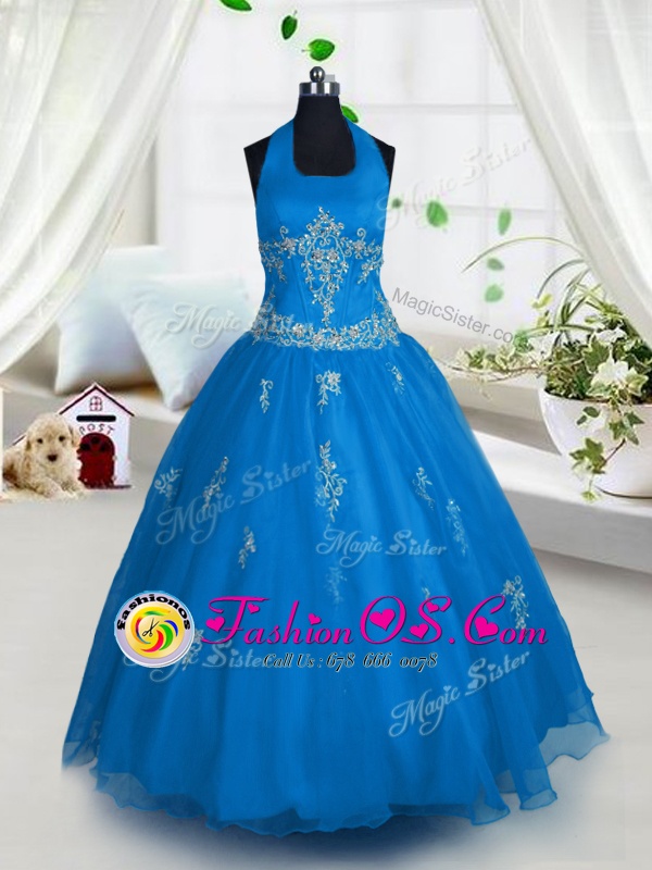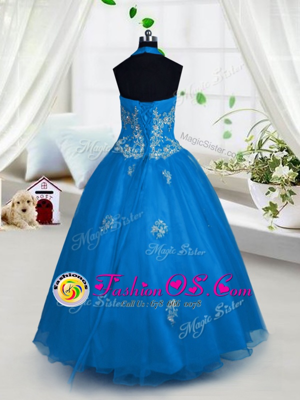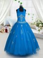 Customized Halter Top Sleeveless Tulle Floor Length Lace Up Pageant Gowns For Girls in Aqua Blue for with Appliques