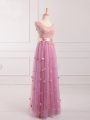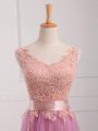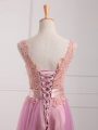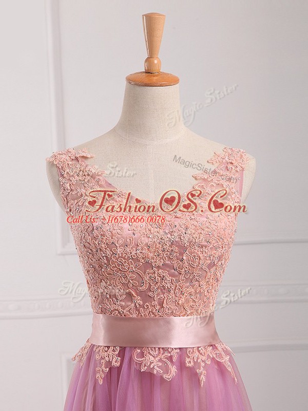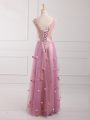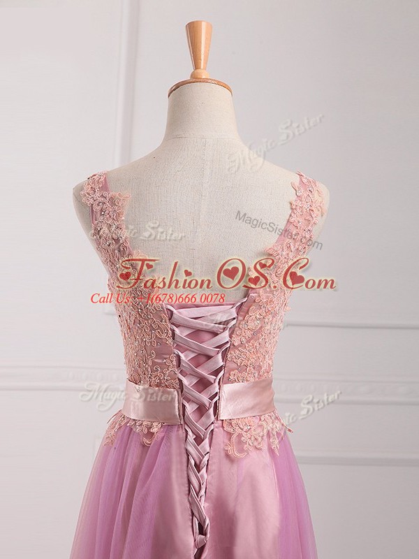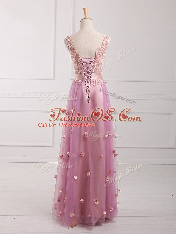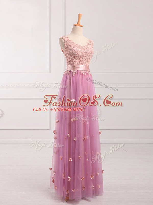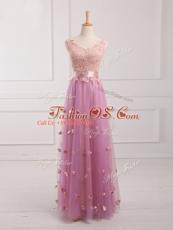 Customized Lilac Tulle Lace Up V-neck Sleeveless Floor Length Bridesmaid Dress Lace and Appliques