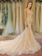 Home >  Wedding Dresses >  Affordable Wedding Dresses > Customized Mermaid Champagne Tulle Lace Up Sweetheart Sleeveless With Train Wedding Gown Court Train Appliques and Hand Made Flower