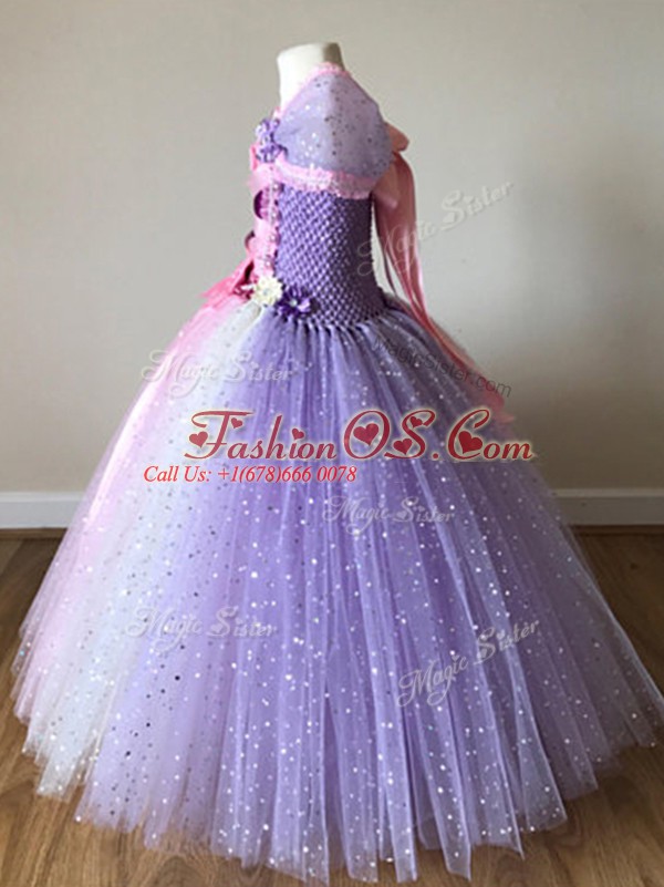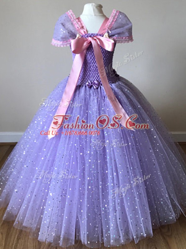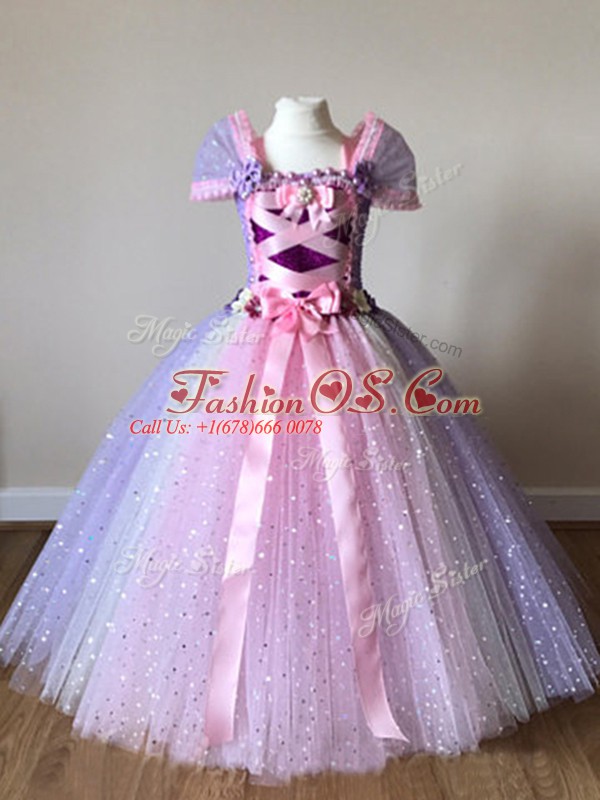 Customized Multi-color Cap Sleeves Floor Length Sequins and Bowknot Side Zipper Little Girls Pageant Dress