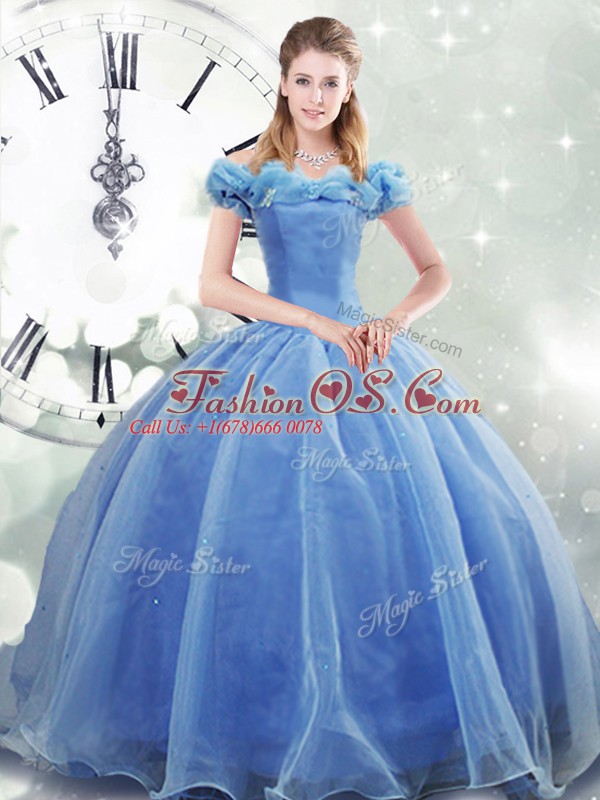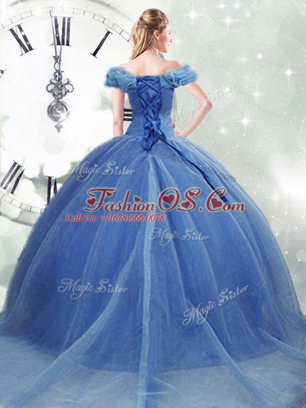 Customized Off The Shoulder Sleeveless Brush Train Lace Up Quinceanera Dress Light Blue Organza
