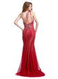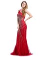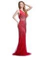 Customized One Shoulder Red Tulle Zipper Evening Dress Sleeveless With Brush Train Beading