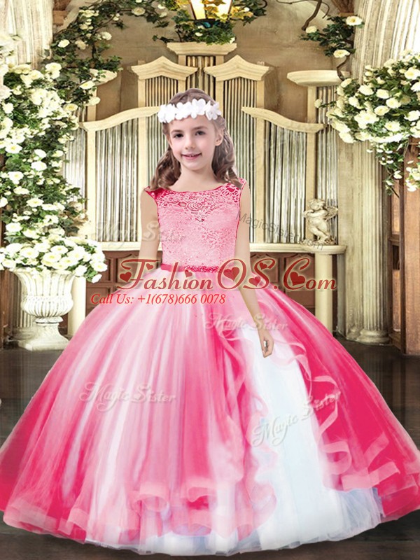 Customized Pink Ball Gowns Lace Kids Pageant Dress Zipper Tulle Sleeveless Floor Length
