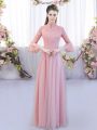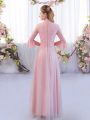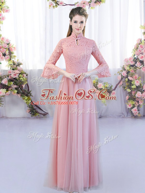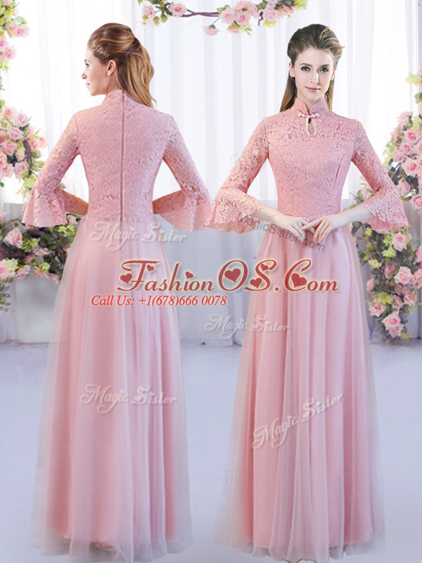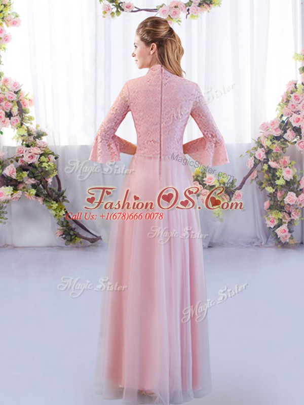 Customized Pink Empire Tulle High-neck 3 4 Length Sleeve Lace Floor Length Zipper Bridesmaid Gown