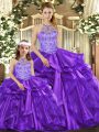 Customized Purple Quinceanera Gown Sweet 16 and Quinceanera with Beading and Ruffles Halter Top Sleeveless Lace Up