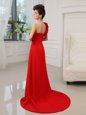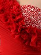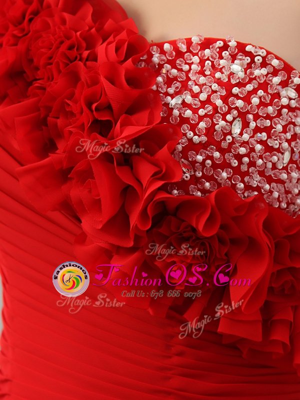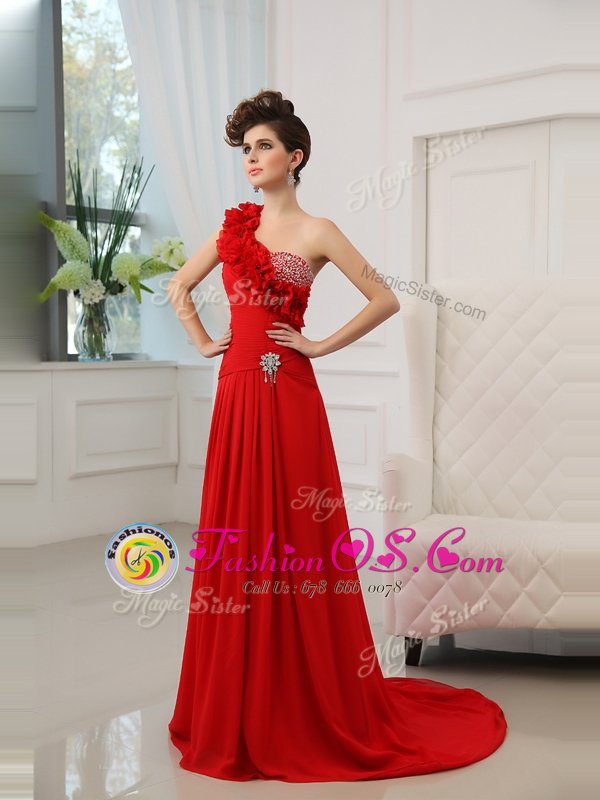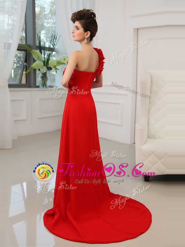 Customized Red Column/Sheath One Shoulder Sleeveless Satin With Train Court Train Zipper Beading and Hand Made Flower Celebrity Inspired Dress
