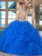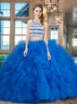Customized Scoop Backless Blue Sleeveless Beading and Ruffles Floor Length 15th Birthday Dress