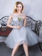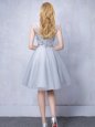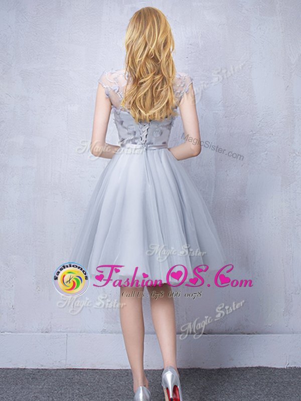 Customized Scoop Grey Lace Up Quinceanera Court Dresses Lace and Appliques and Belt Cap Sleeves Knee Length