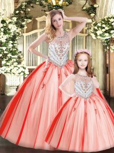 Customized Scoop Sleeveless Lace Up Vestidos de Quinceanera Red Tulle