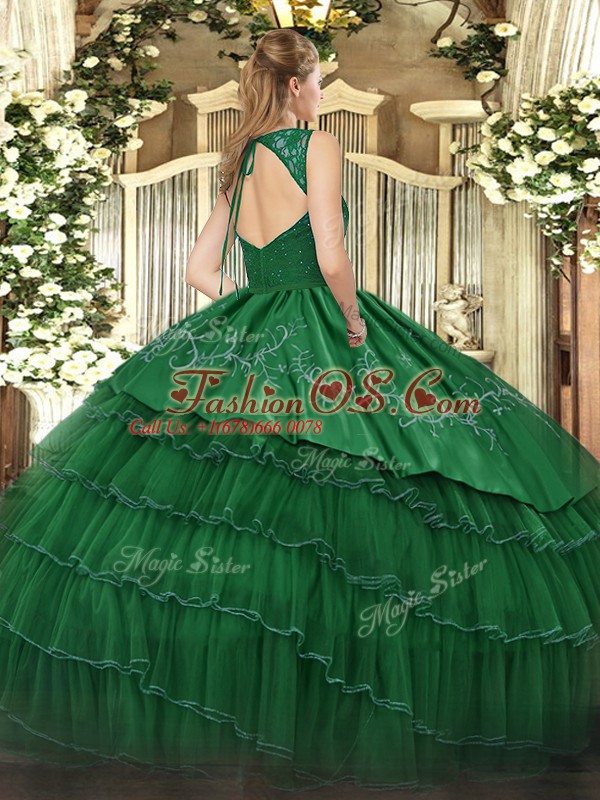 Customized Sleeveless Floor Length Beading and Lace and Embroidery and Ruffled Layers Backless Sweet 16 Quinceanera Dress with Dark Green