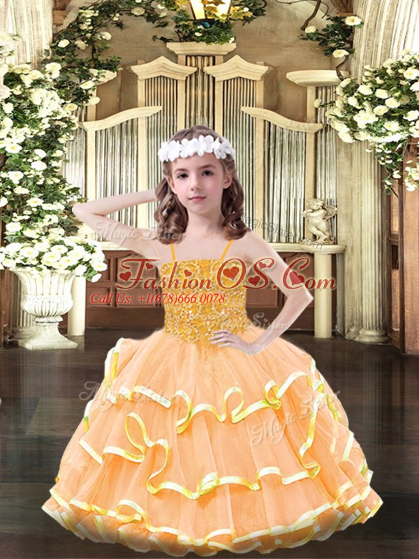 Home >  Special Occasion Dresses >  Beautiful Kids Pageant Dresses > Customized Sleeveless Floor Length Beading and Ruffled Layers Lace Up Custom Made Pageant Dress with Orange