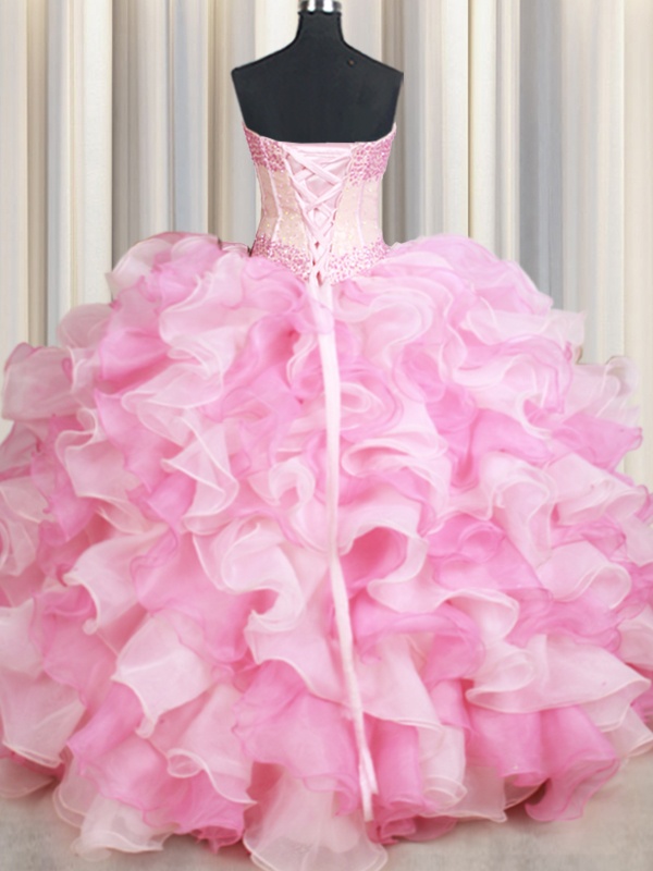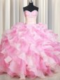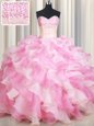 Customized Sleeveless Floor Length Beading and Ruffles Lace Up Sweet 16 Quinceanera Dress with Pink And White