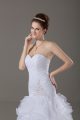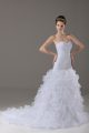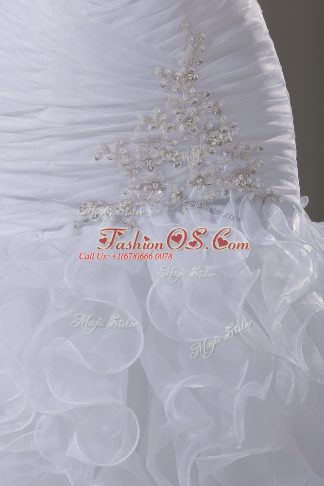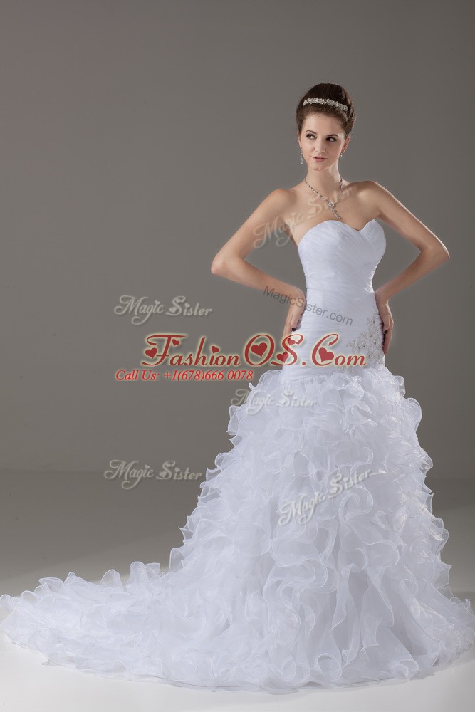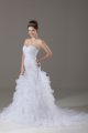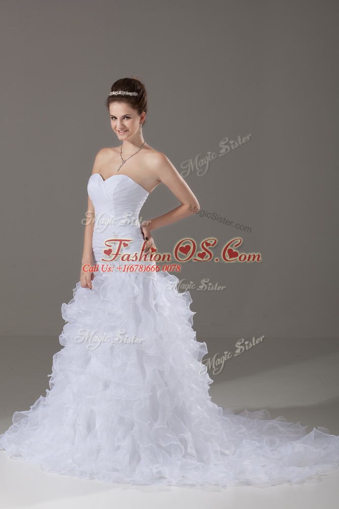 Customized White Lace Up Sweetheart Beading and Ruffles Wedding Dresses Organza Sleeveless Brush Train