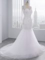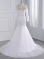 Customized White Tulle Zipper Scoop Long Sleeves Wedding Gown Brush Train Beading and Lace and Appliques