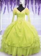 Customized Yellow Green Lace Up V-neck Beading and Embroidery and Ruffles Quince Ball Gowns Organza Sleeveless