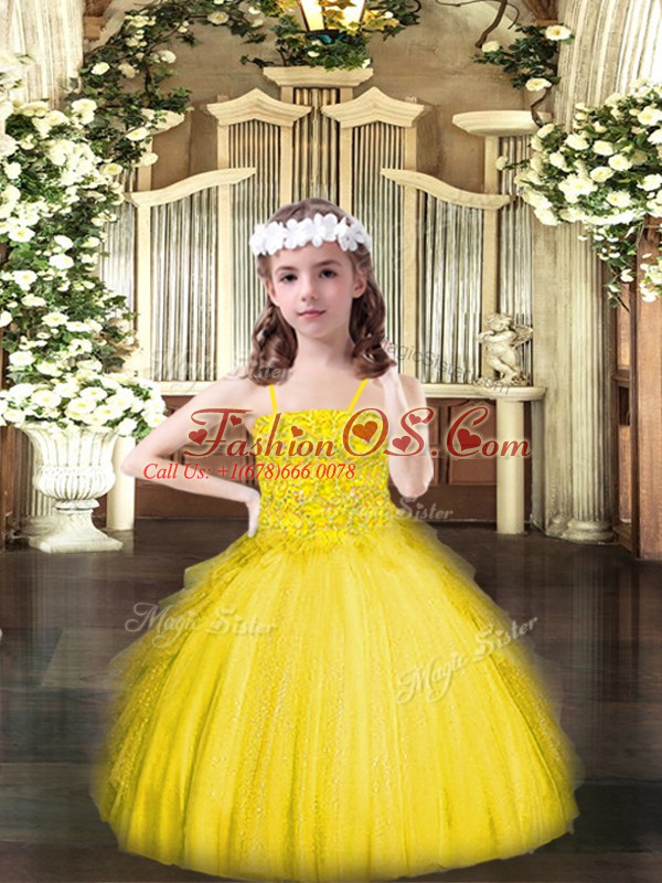 Home >  Special Occasion Dresses >  Beautiful Kids Pageant Dresses > Customized Yellow Tulle Lace Up Spaghetti Straps Sleeveless Floor Length Pageant Dress Beading and Ruffles