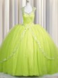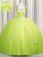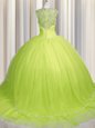 Customized Zipper Up Yellow Green Ball Gowns Tulle Sweetheart Cap Sleeves Beading and Appliques With Train Zipper Quinceanera Dress Brush Train