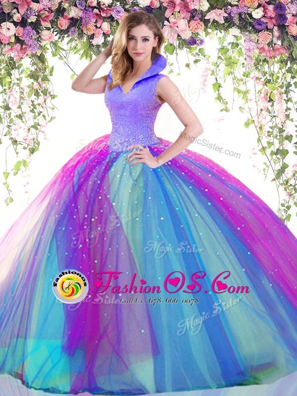 Cute Backless High-neck Sleeveless 15th Birthday Dress Floor Length Beading Multi-color Satin and Tulle