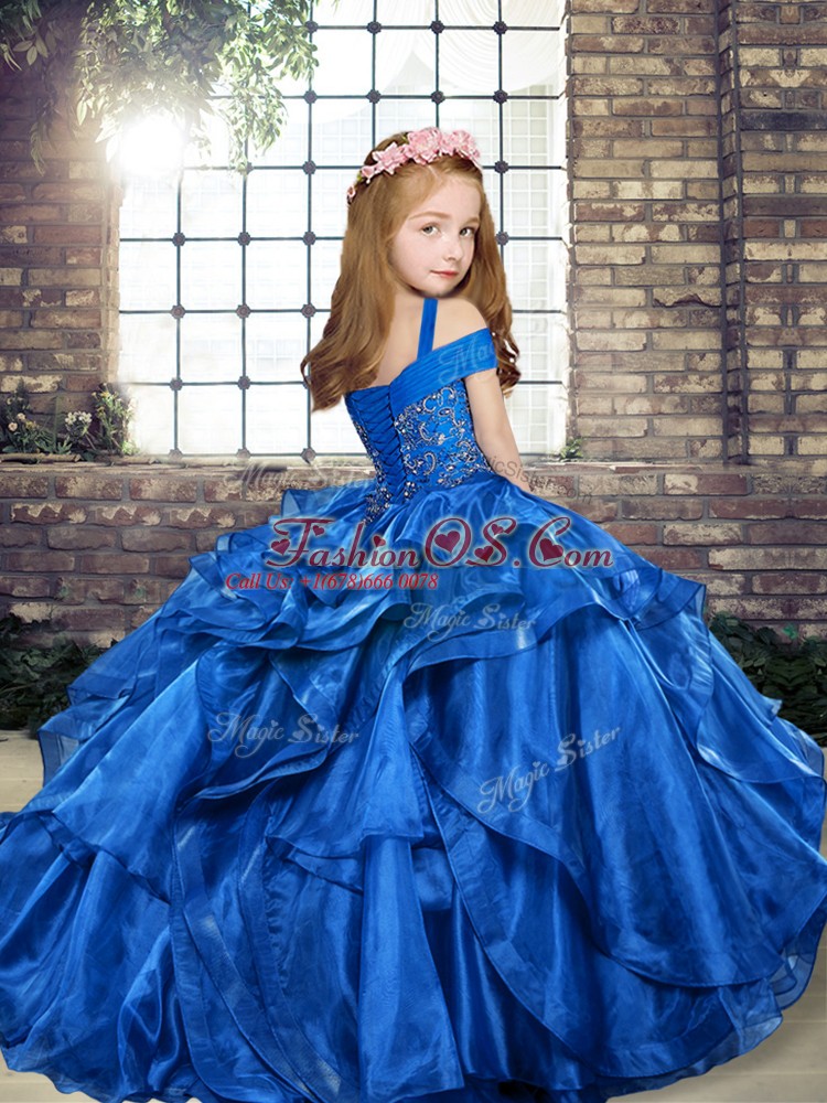 Cute Floor Length Blue Pageant Dress Toddler Organza Sleeveless Beading and Ruffles