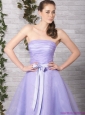 Cute Lilac Strapless Ruching Mini Length Prom Dresses with Bownot