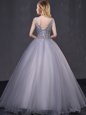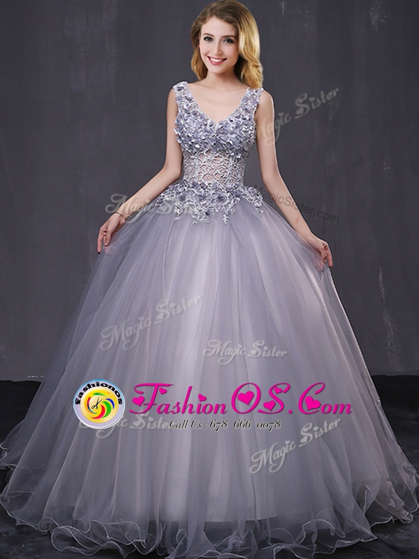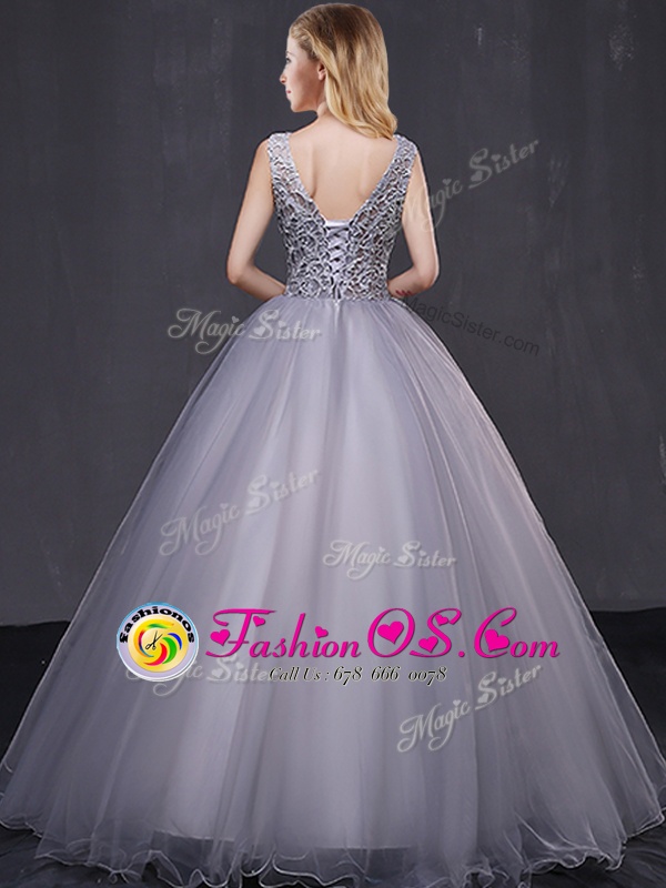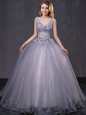 Cute Peach Tulle Lace Up Quince Ball Gowns Sleeveless Floor Length Appliques and Belt
