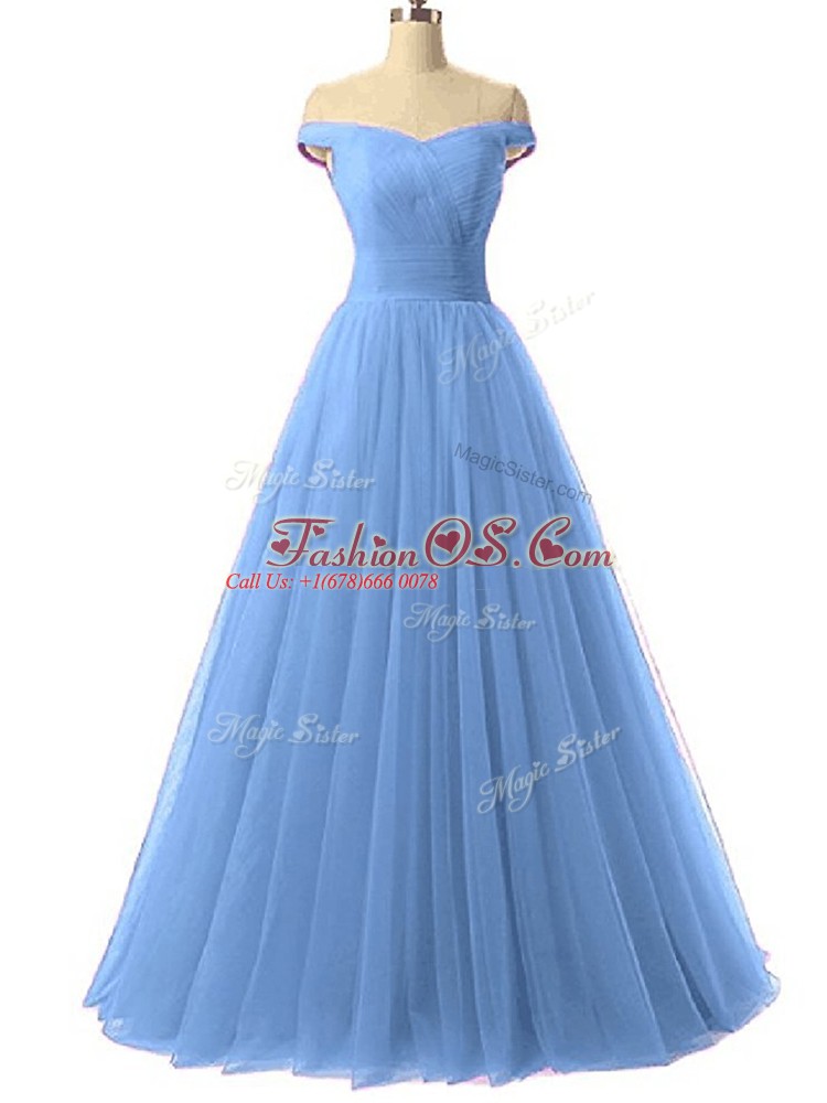 Cute Royal Blue A-line Off The Shoulder Sleeveless Tulle Floor Length Lace Up Ruching Prom Evening Gown