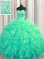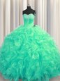 Cute Sleeveless Beading and Ruffles Lace Up 15 Quinceanera Dress with Turquoise Brush Train