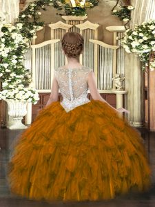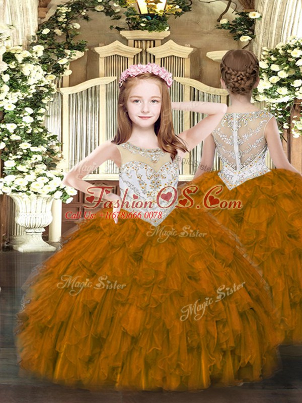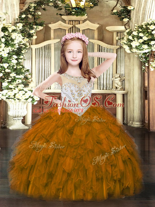 Cute Sleeveless Organza Floor Length Zipper Pageant Dress for Girls in Brown with Beading
