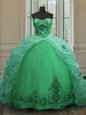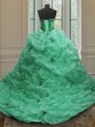 Home >  Quinceanera Dresses >  Sweet 16 Dresses > Cute Sleeveless Organza With Train Court Train Lace Up Ball Gown Prom Dress in Green for with Beading and Appliques and Pick Ups