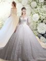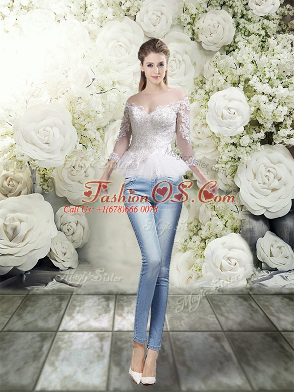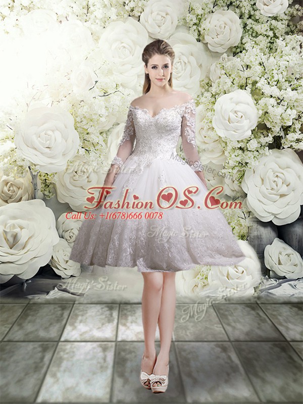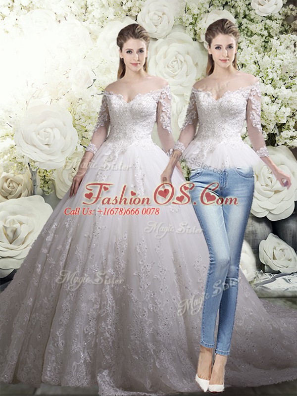 Cute White Wedding Dresses Wedding Party with Lace Off The Shoulder 3 4 Length Sleeve Chapel Train Zipper