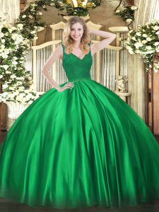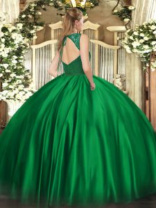 Dark Green Ball Gowns Beading and Lace Sweet 16 Quinceanera Dress Backless Satin Sleeveless Floor Length