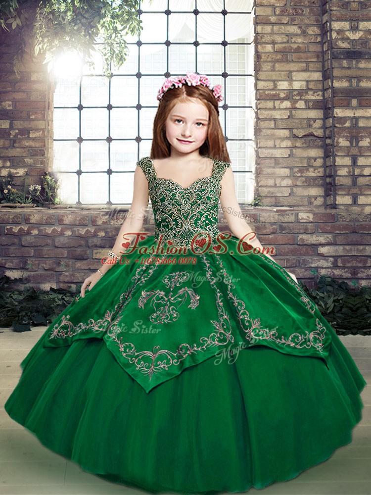 Dark Green Kids Pageant Dress Party and Military Ball and Wedding Party with Beading and Embroidery Straps Sleeveless Lace Up