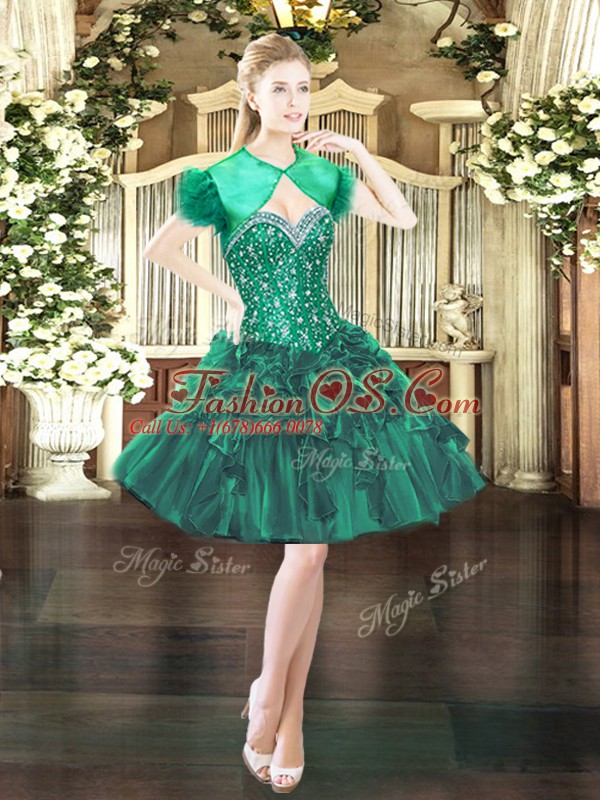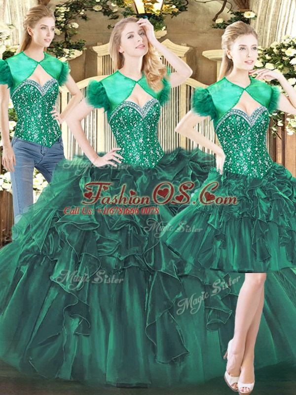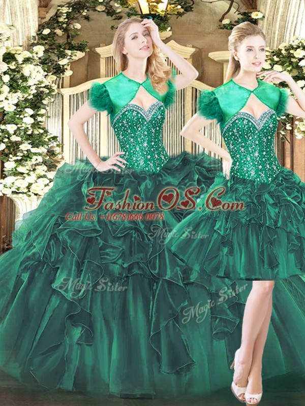 Dark Green Lace Up Sweetheart Beading and Ruffles Quince Ball Gowns Tulle Sleeveless