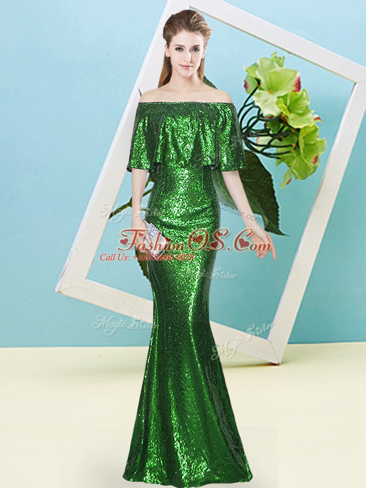 Dark Green Mermaid Sequined Off The Shoulder Half Sleeves Sequins Floor Length Zipper Dress for Prom
