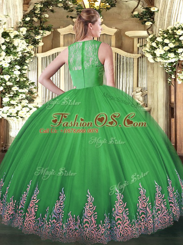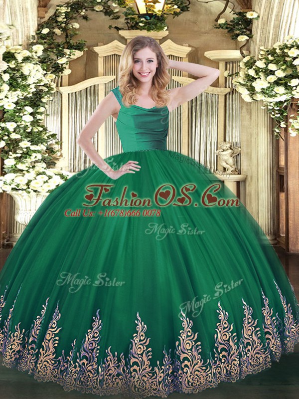 Dark Green Zipper Straps Lace and Appliques Vestidos de Quinceanera Tulle Sleeveless