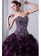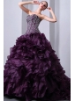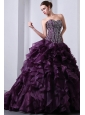 Home >  Quinceanera Dresses >  Pretty Quinceanera Dresses > Dark Purple A-Line / Princess Sweetheart Beading and Ruffles Quinceanera Dress Brush Train Organza