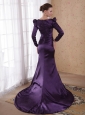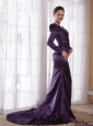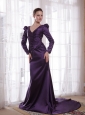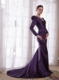 Subtle elegance is yours for the taking with this purple dress. This fabulous mother of the bride dress features a long sleeve v-neckline with a fitted mermaid silhouette, accented with a ruched bodice and scattered sequins. The skirt hugs your figure and flares below the knees for a stunning look. This gorgeous dress completes with a sweep train.