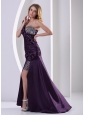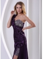 Dark Purple High Slit One Shoulder Ruched Bodice and Bead Decorate Celebrity Dress Party Style