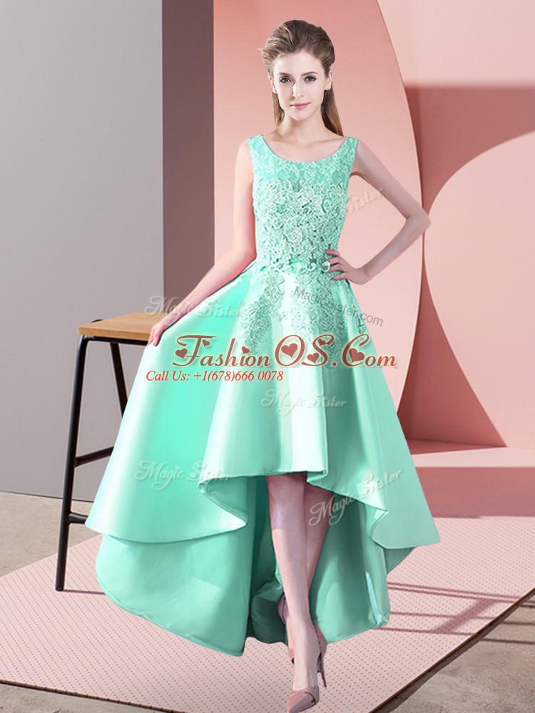 Dazzling Apple Green A-line Satin Scoop Sleeveless Lace High Low Zipper Damas Dress