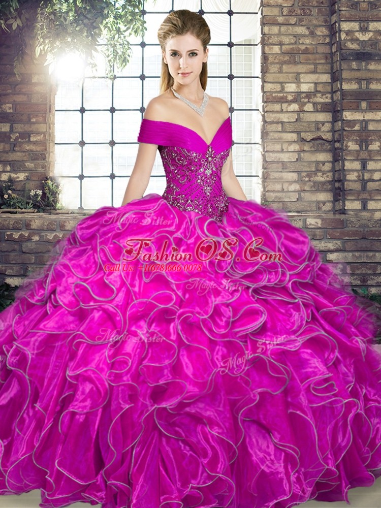 Home >  Quinceanera Dresses >  Fast Delivery Quinceanera Dresses > Dazzling Ball Gowns 15 Quinceanera Dress Fuchsia Off The Shoulder Organza Sleeveless Floor Length Lace Up