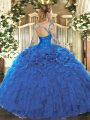 Dazzling Blue Scoop Neckline Lace and Ruffles Ball Gown Prom Dress Long Sleeves Lace Up