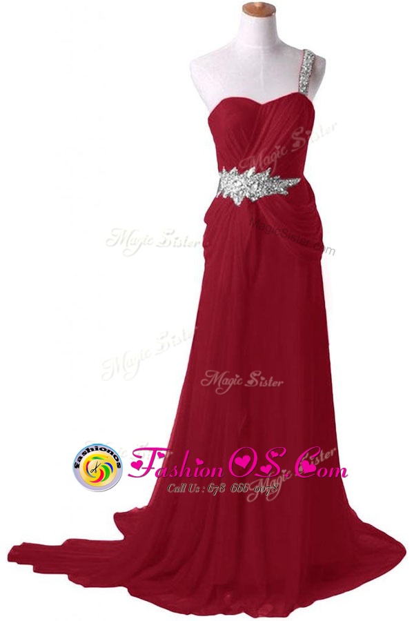 Home >  Prom Dresses >  Prom Dresses On Sale > Dazzling Burgundy Prom Evening Gown Prom and For with Beading One Shoulder Sleeveless Watteau Train Zipper