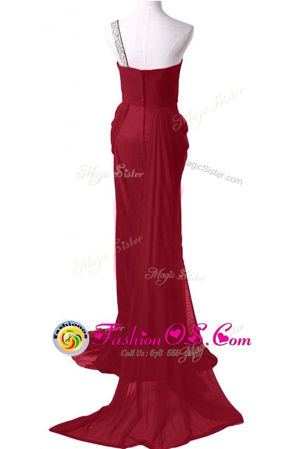 Dazzling Burgundy Prom Evening Gown Prom and For with Beading One Shoulder Sleeveless Watteau Train Zipper